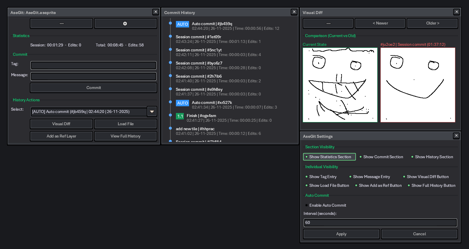 AseGit is a lightweight version-control helper for Aseprite. It creates simple, local snapshots of your sprite file, records metadata (message, tag, timestamp, edits and session time), and provides a small UI inside Aseprite for browsing, visual diffing, and reloading past snapshots.